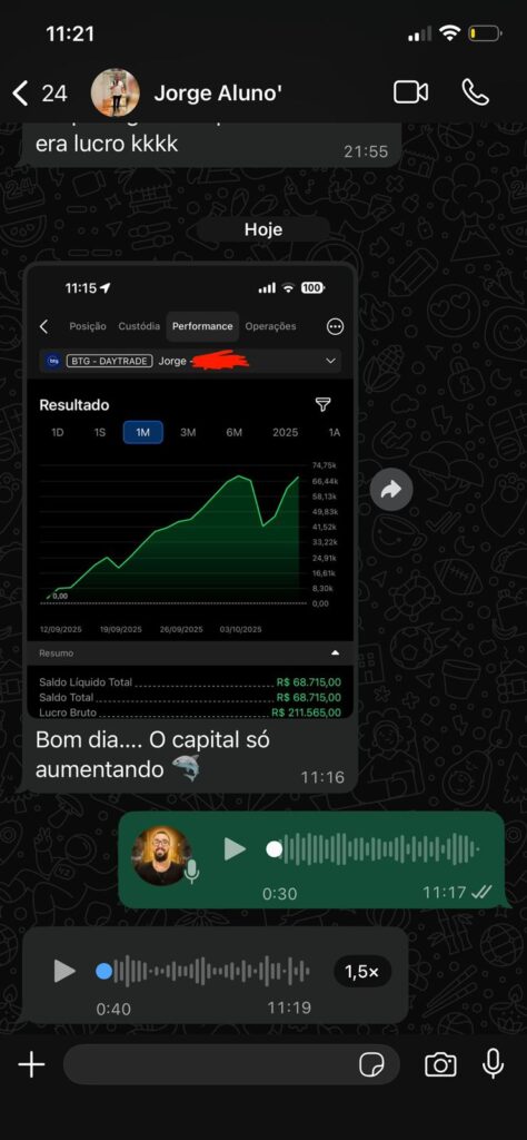 Hoje com mais de 3711 pregões, com minha experiência, depois de tudo que eu ja vi e vivi, ajudo pessoas neste mundo do Day Trade a ter consistência, lucros reais e liberdade.